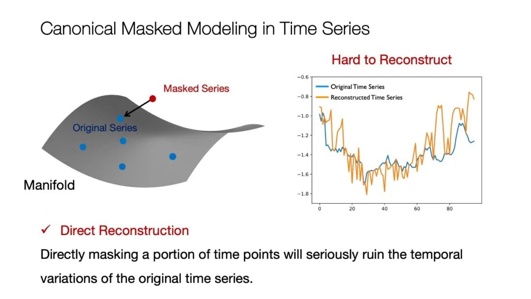 我们做了一个简单的实验,把某个时间序列Masked的50%让深度模型去重建。图片右边的橘色线条是重建结果,蓝色线条是原始状态,通过对比可以看到重建的结果非常差。这意味着在原始的时间序列流行之中,给它Masked就相当于做一个扰动得到红色点,把它再重新投影回流行之中,这个过程其实是很困难的。