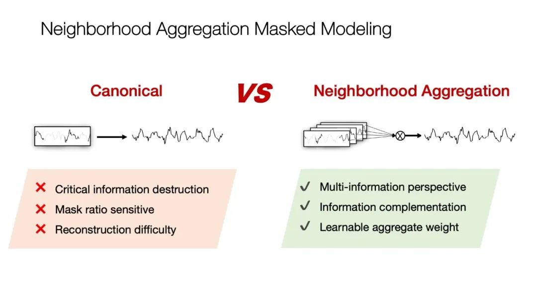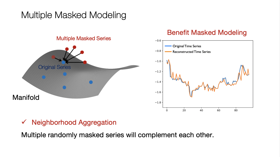 在研究的过程中我们产生了一个新的想法,能不能借助流形学习里面一个非常重要的概念Neighborhood Aggregation也就是近邻聚合的思想,不仅仅是依靠自己去重建,而是依靠身边的近邻点去重建。对于一个时间序列来说,连续对它Masked四、五次(Masked都是随机的),这四、五次时间序列之间是会有一个互相互补的信息,这样就可以让重建变得更好。当然重建不是最终目的,重建变得更好可以让模型训练得更好,最终目的是指导模型训练。