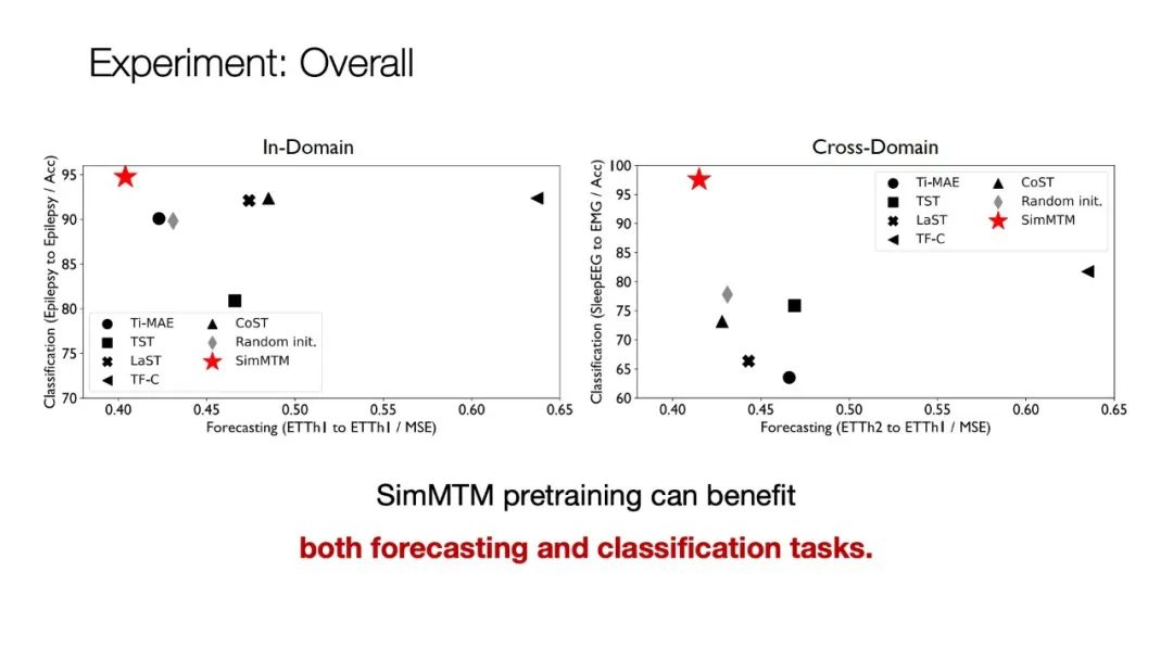 我们也进行了领域内和跨领域的测试,跨领域是指在一个完全不一样的数据集上预训练,然后在另外一个数据集上做测试。最后SimMTM的表现还是不错的,也可以提升Fine-tuning的效果。