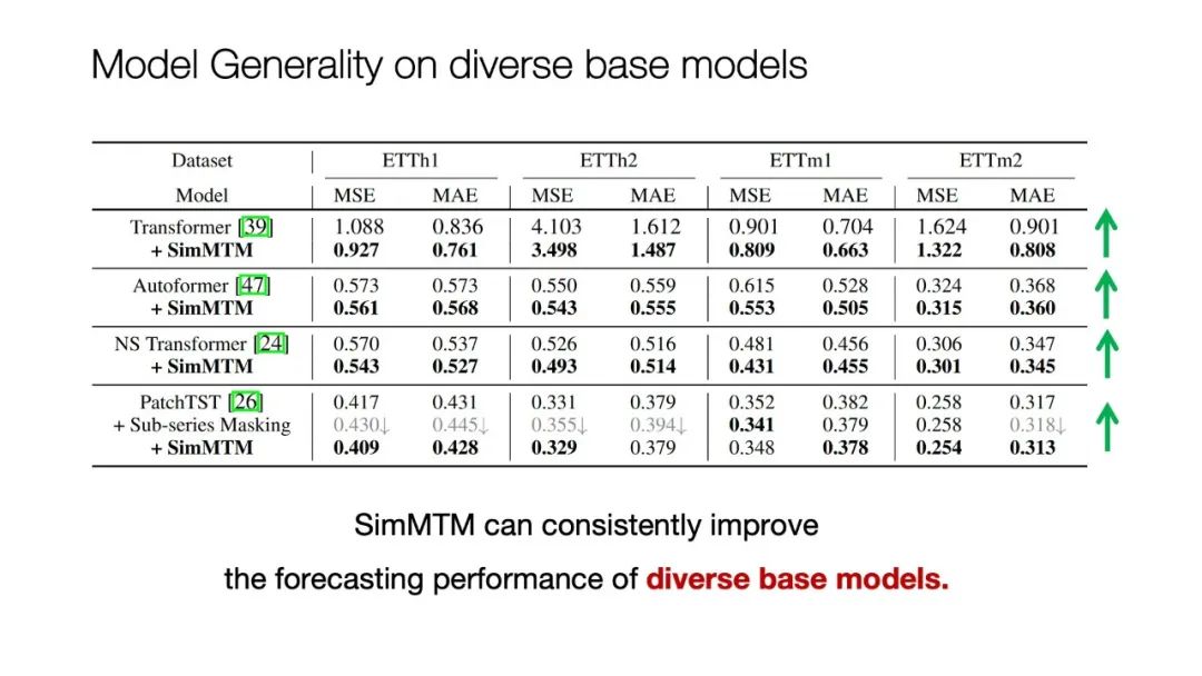 除此之外,我们发现这个模型预训练方法,还可以一致性的提升时间序列预测模型的效果,图片中显示的是我们选的几个比较前沿的时间序列预测模型测试结果,用我们这个方法预训练完之后,再去Fine-tuning,这些模型的效果变得更好了。