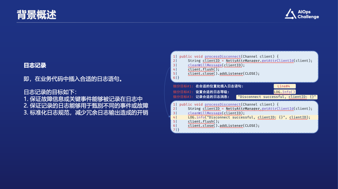我们的研究重点是日志语句的生成。众所周知,日志是运维的关键数据资源。日志语句的质量直接关系到日志分析的效果。优质的日志语句能够显著提升数据的可用性和分析的准确性,因此,确保程序记录的日志信息和开发者所收集的日志内容都高质量至关重要。