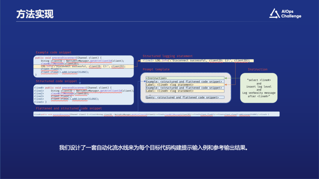 实现思路如上图所示,下方蓝色框里是给到的程序输入,即一段尚未加入日志语句的代码。接到该代码片段后,UniLog会利用历史代码库中已含日志语句的代码段作为参考,并将其与待注入日志的目标代码一同送入大规模语言模型中进行分析。右下角框里的是我们期望大语言模型告诉我们的结果,它包括行号以及具体带日志的代码片段。
