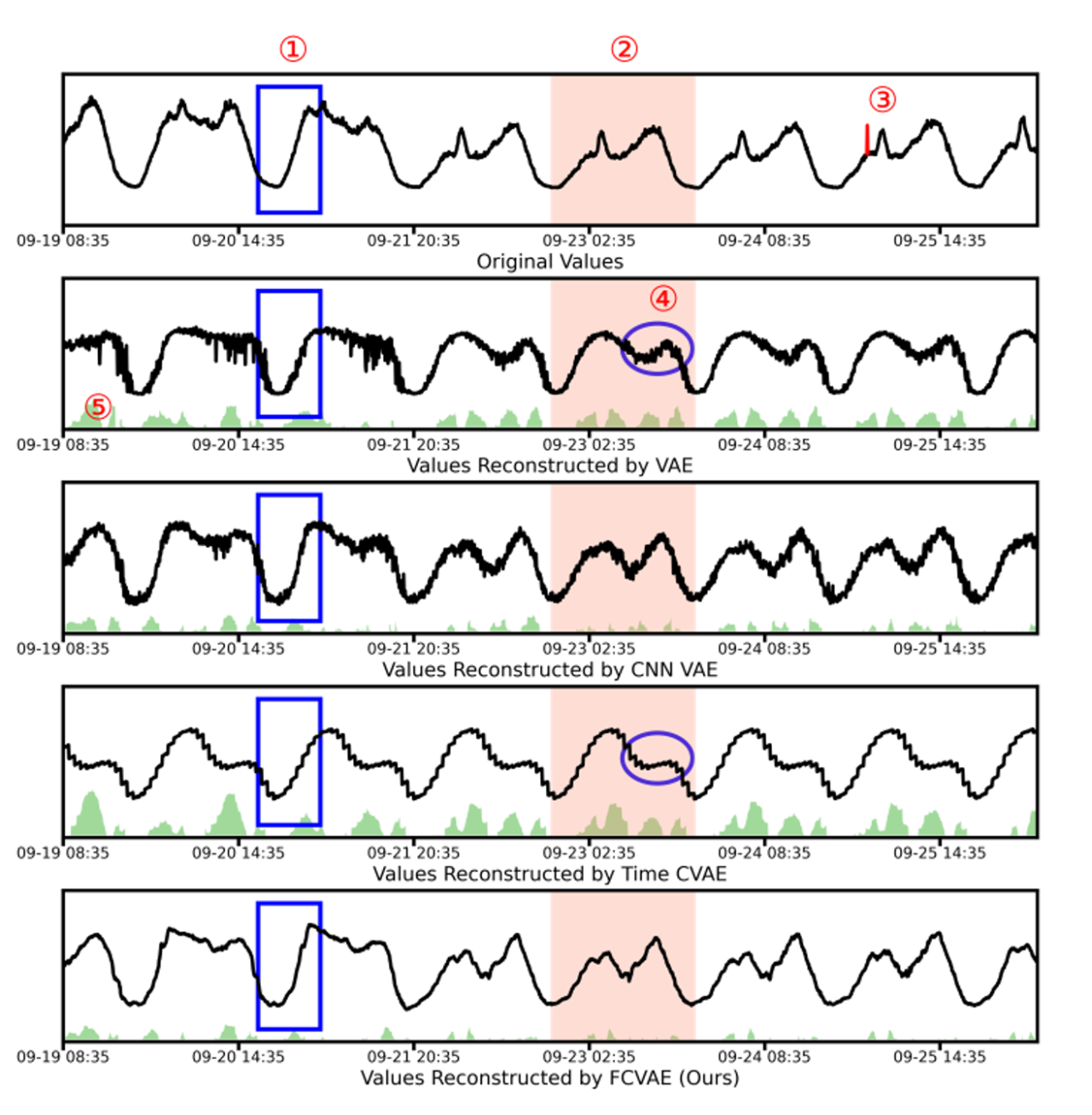 为了保证Web系统的服务质量以及安全性,大型公司通常会定期监控一些关键指标,这些指标经过时间积累形成时序曲线。单时序异常通常指的是某个时刻的值偏离历史正常值。然而目前的基于VAE重建的方法重建正常值的效果并不好。