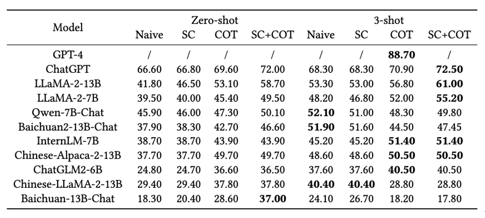 - 对于大多数模型,从Naive到SC、CoT、CoT+SC,评估性能稳步提高,其中CoT带来的提高最为显著。